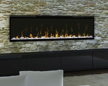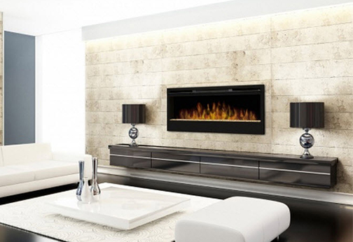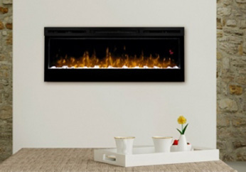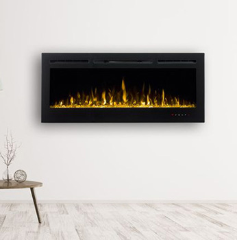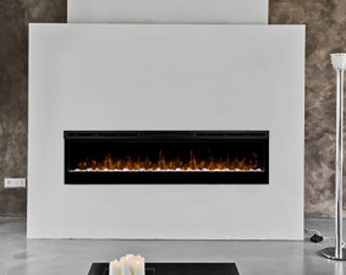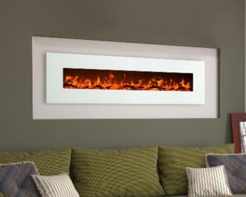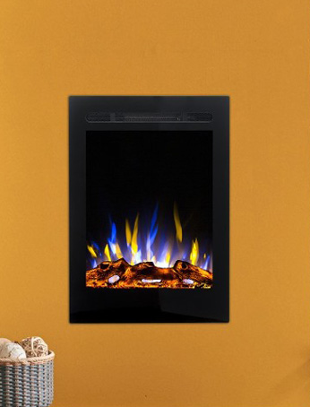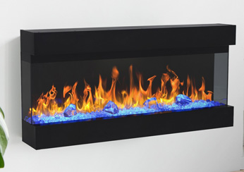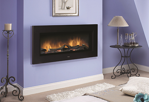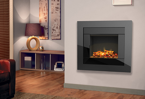 Moderný krb určený na zavesenie na stenu s efektom plameňa Optiflame® a prebleskujúcou pahrebou Optiglo®, s čiernou povrchovou úpravou. Vhodný pre väčšie miestnosti, vytvára pocit tepla a luxusu.