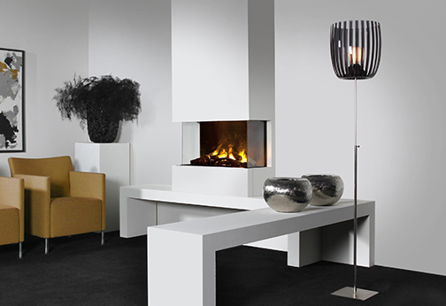 Zabudovateľný elektrický krb s možnosťou prevedenia ako čelný, rohový alebo trojstranný.