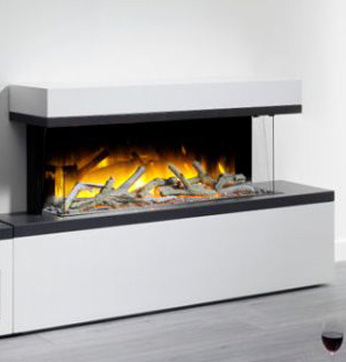 Trojstranný elektrický krb vystupujúci do priestoru s polienkami aj kryštálmi.