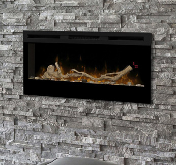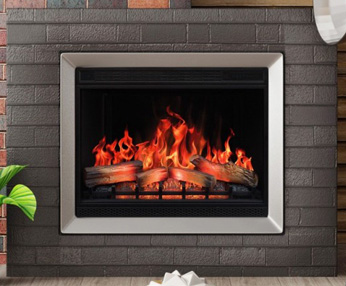 Moderný elektrický krb určený na zabudovanie s polienkami a tehlovým zadným panelom.
