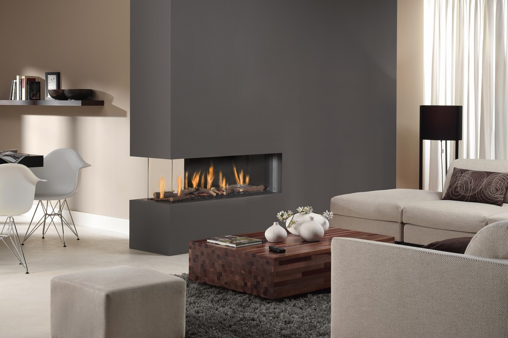 Zaujímavé presklenie horizontálneho krbu na netradičné rozdelenie miestnosti.