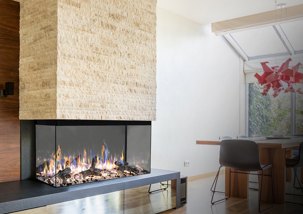 Zabudovateľný elektrický krb s možnosťou prevedenia ako čelný, rohový alebo trojstranný.