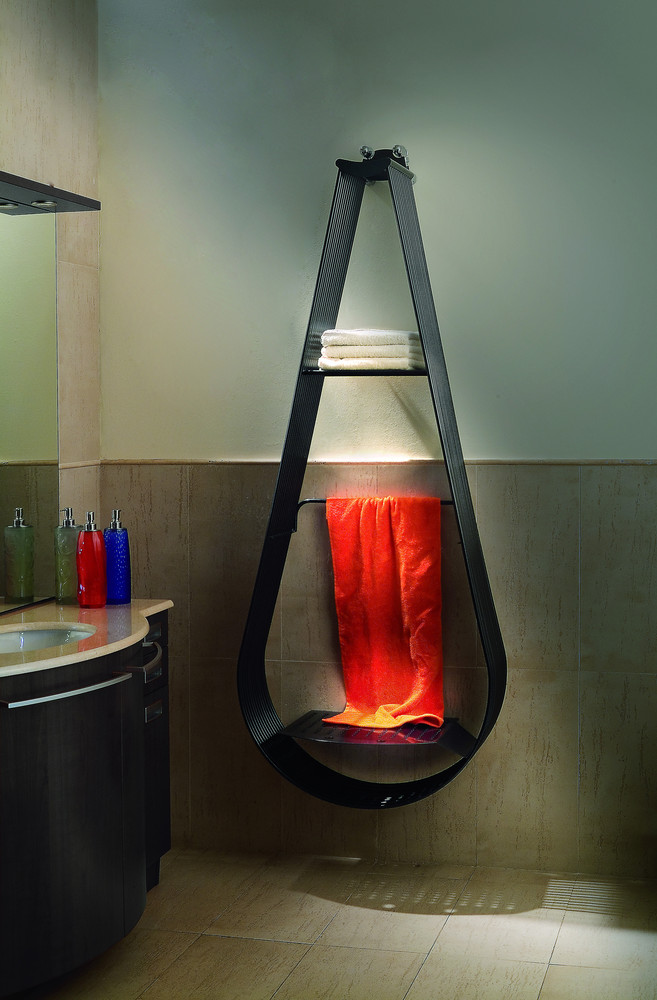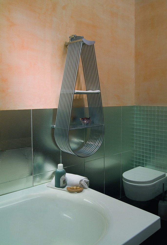 Vyhrievaný sušiak s oblými okrúhlymi trúbkami a poličkami na uteráky. Najväčšia veľkosť sa dodáva ako celok so sedadlom, ktoré Vám umožní užiť si posedenie v obkolesení tepla: je to dôležité pre kúpeľne.