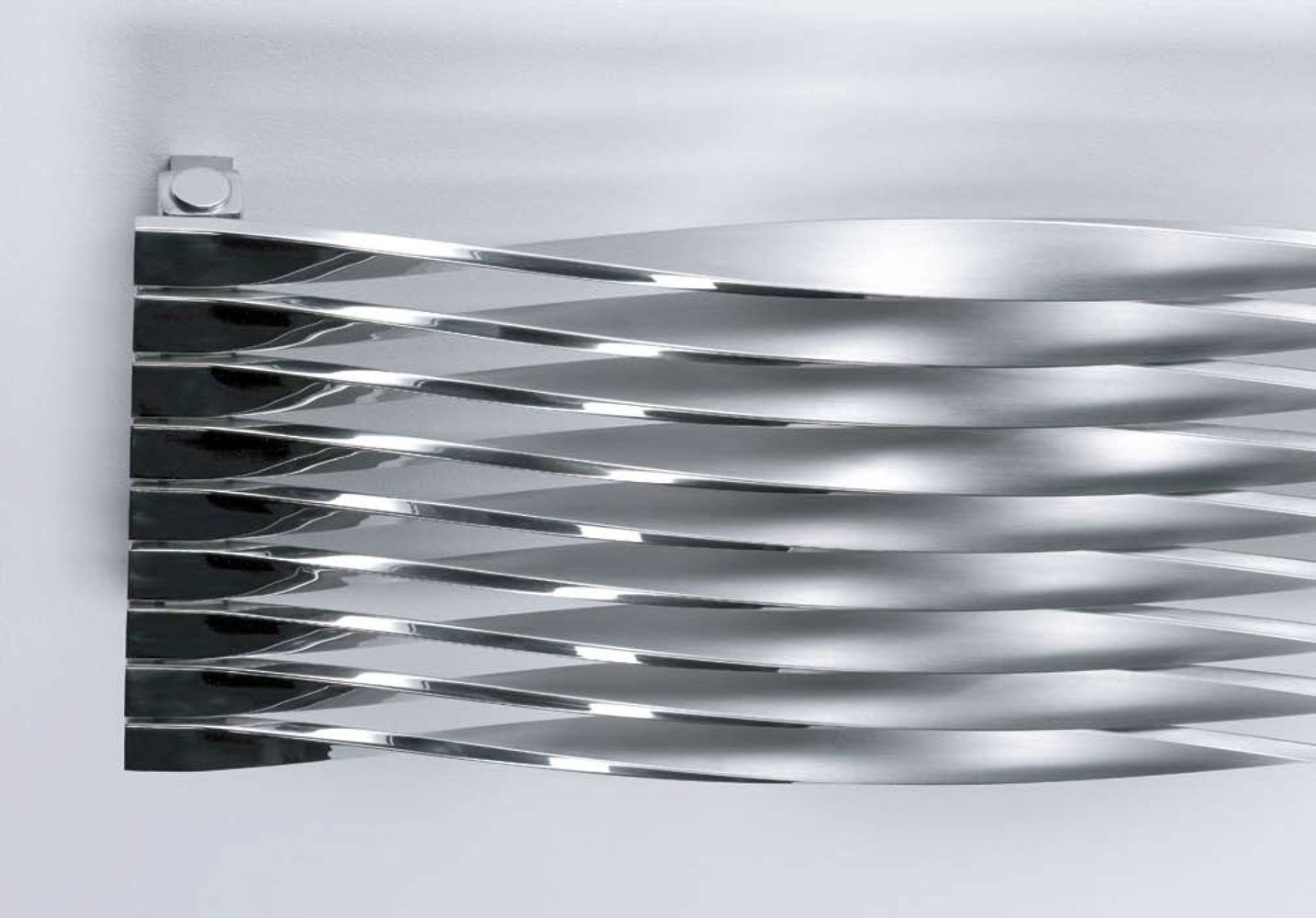 Vzrušujúci nový radiátor Twister s dizajnom, ktorý predstavuje až deväť trikrát pretočených tyčí, ktoré striedavo odhaľujú brúsené a leštené plochy.